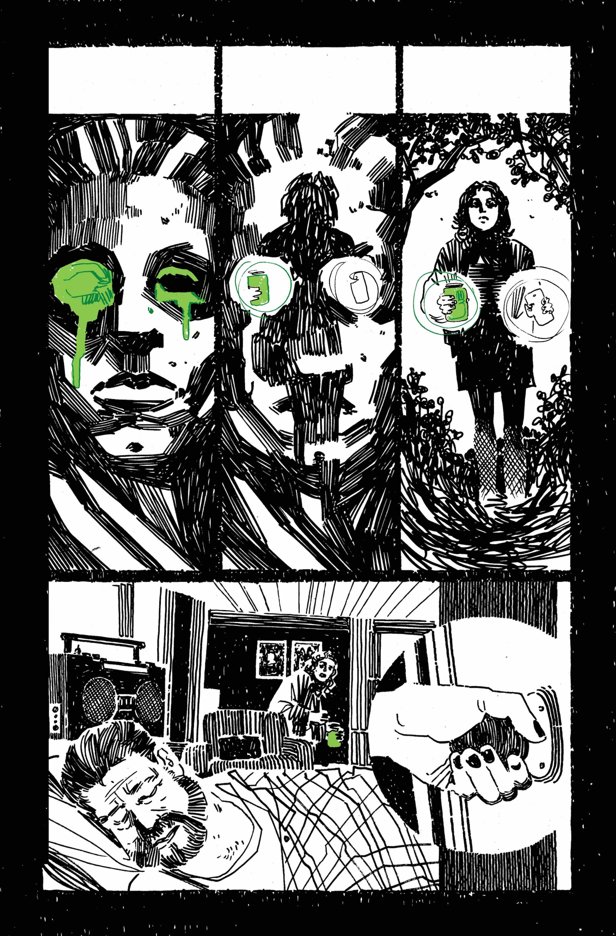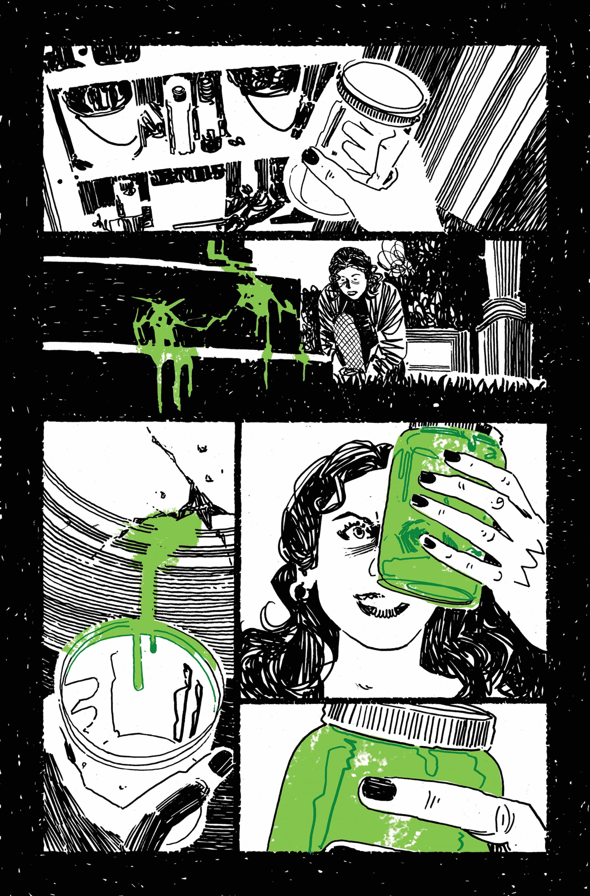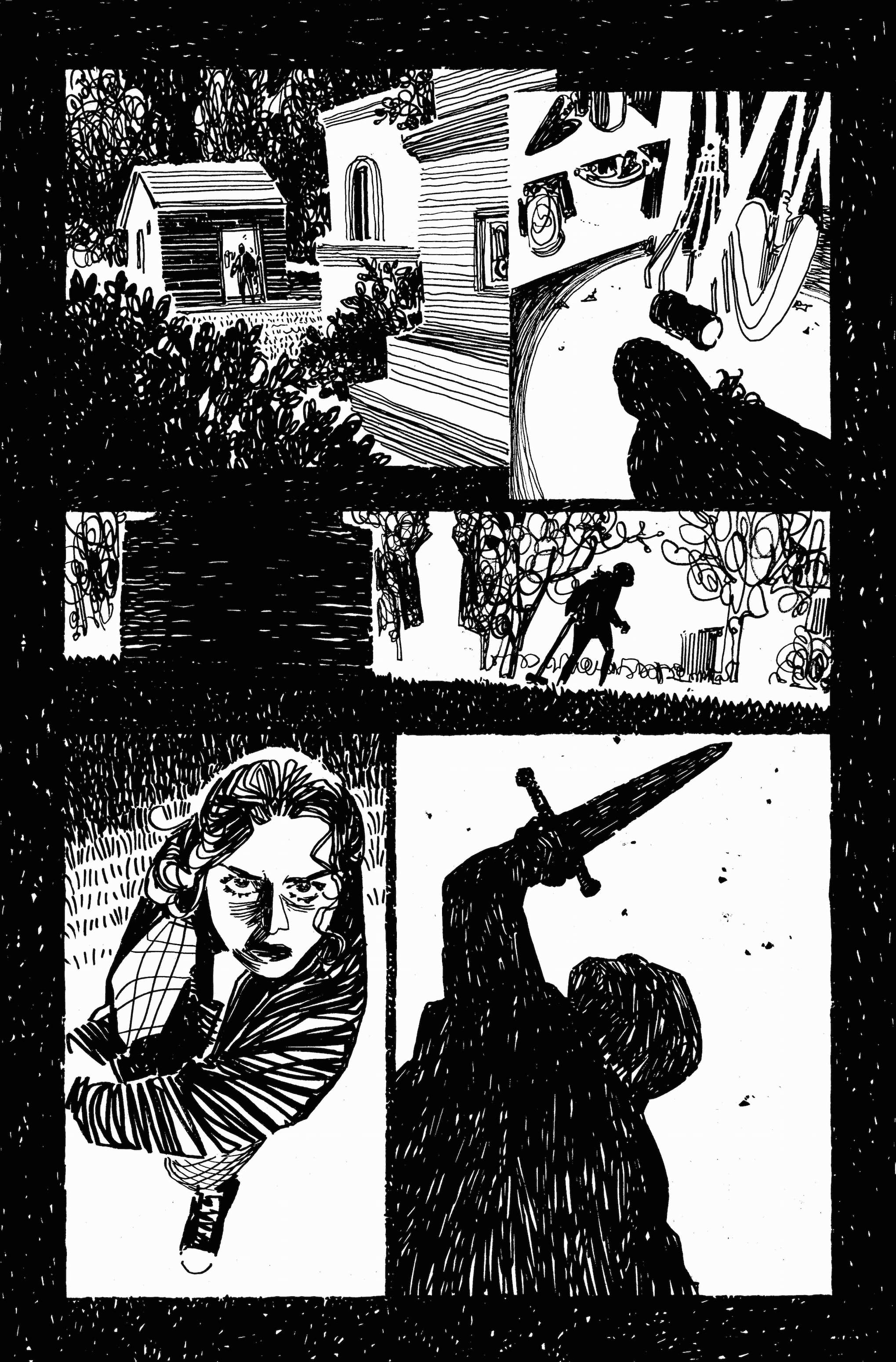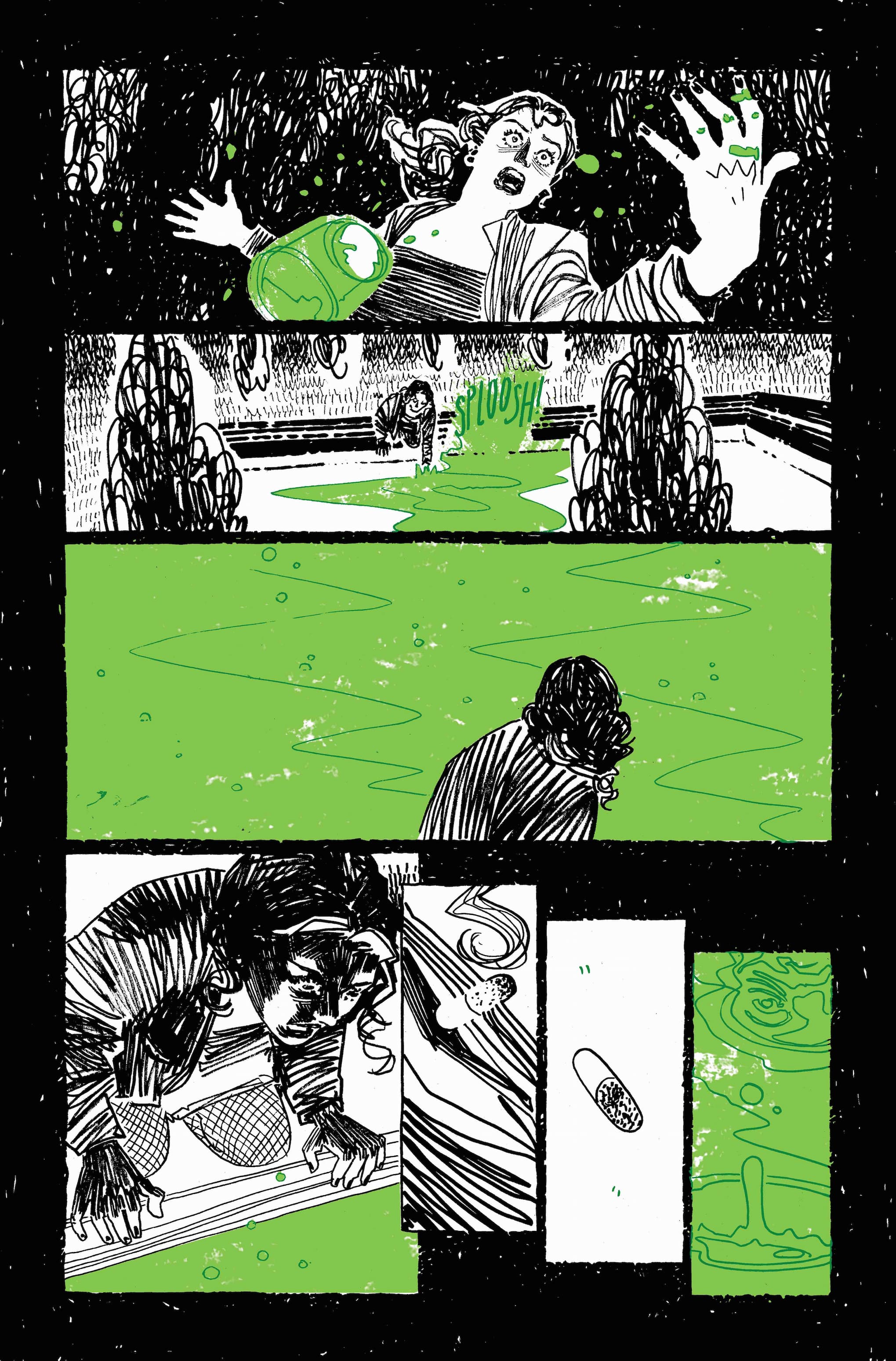 "Working on Athanasia was such a unique experience. Wanted to find a way to adapt Daniel's script in a way that would reflect the characters and the story on my art style so chose to go with a more detailed style than my usual blocks of ink in order to symbolize the fragility of the relationships described in the book. Couldn't be happier with how things turned out, especially when Brad [Simpson] added his final touches of green!"