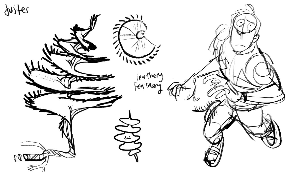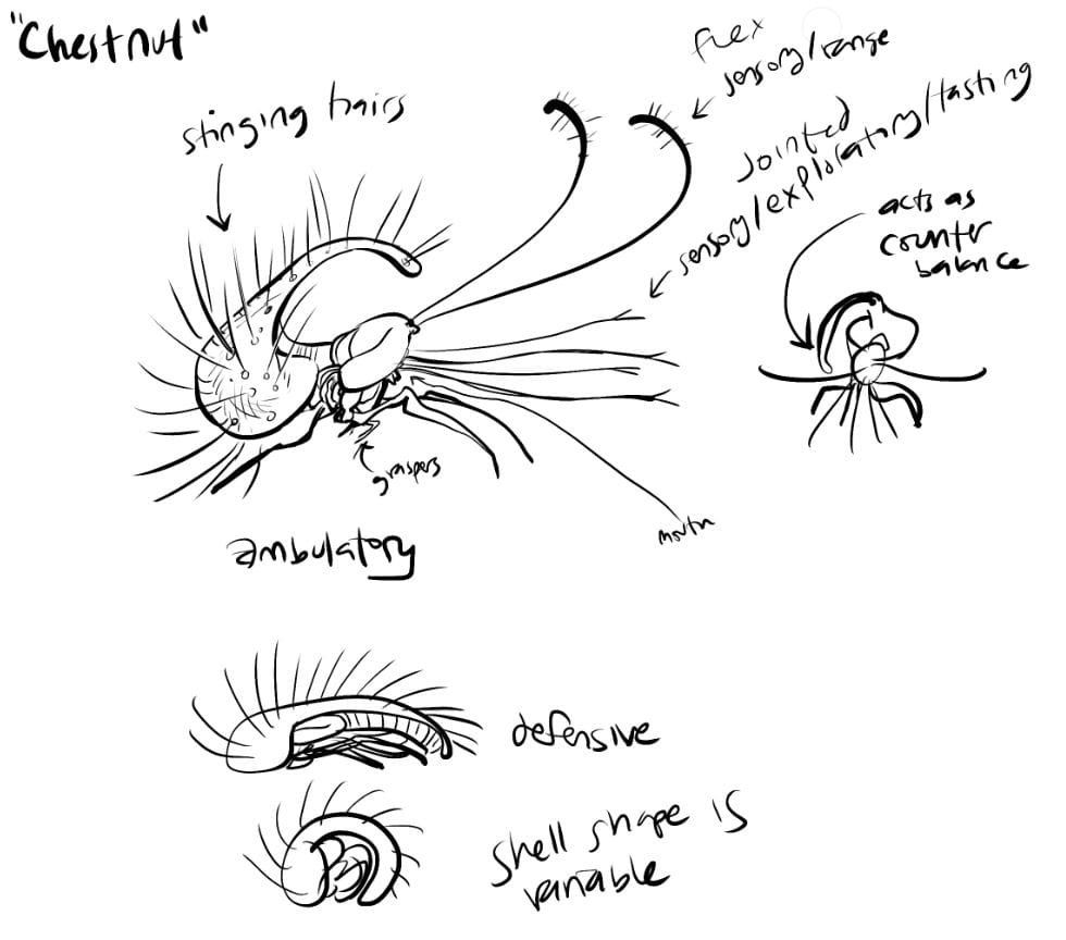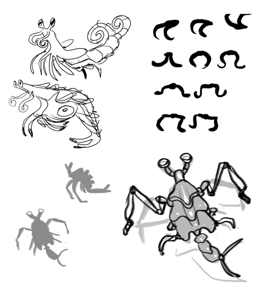 Here are some original concepts for some alien characters, whose designs changed a lot from development to final. The defining decision I made for this story was to have the aliens convey emotion entirely through movement of their strange bodies without relying on recognizable human facial expressions… after all, our ability to connect with each other and empathize despite our differences is what makes human beings so worth admiring.
